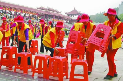 湄洲媽祖義工們參加活動,一般身著寫有“媽祖義工”字樣的黃色馬甲,他們?yōu)閬碜愿鞯氐膵屪嫘疟姾陀慰吞峁┓?wù),如指路、提行李、幫忙購買媽祖糕等。而每次紀(jì)念大會一結(jié)束,馬上就要進(jìn)行祭祀大典和民俗表演,廣場上的人群要迅速離開到看臺上。人一撤離,現(xiàn)場數(shù)千張椅子,如何在短短的幾分鐘內(nèi),全部搬到廣場左右兩側(cè)?300多名媽祖義工發(fā)揮了重要的作用,他們首先把自己坐的椅子撤離,然后迅速跑到廣場內(nèi),大家通力合作,不到10分鐘時間,這些椅子全部被撤離。之后,他們又馬上對現(xiàn)場衛(wèi)生進(jìn)行了清理,確保祭祀大典和民俗活動能夠順利進(jìn)行。