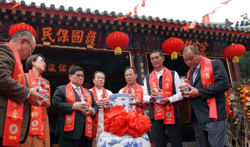 在傳統(tǒng)祭拜儀式后,進入到“眾水合一”的環(huán)節(jié)。來自福建湄洲媽祖祖廟,天津天后宮,臺灣的臺中大甲鎮(zhèn)瀾官、北港朝天宮、新港奉天宮、嘉義頂埔震安宮、麥寮拱范宮等地的兩岸宮廟代表,手捧各自家鄉(xiāng)的圣水,眾水合一依次匯入四海安瀾瓶內(nèi)?!氨娝弦弧痹⒁庵腥A兒女祈盼和平、融合發(fā)展,象征著中華民族同祖同宗、同根同源,祝愿兩岸和平發(fā)展、兩岸民眾共創(chuàng)民族偉大復(fù)興。