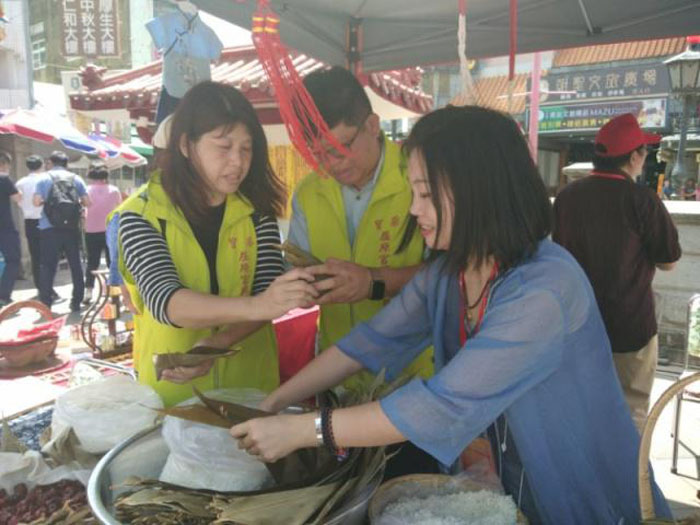 一葉粽香,處處端陽?,F(xiàn)場,兩岸同胞還一起包粽子、享美食。來自天津的非遺民俗老師向臺灣民眾講述了粽子的由來以及天津粽子的特色。