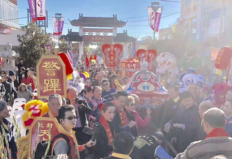 活動當(dāng)日,悉尼天后宮舉行了起轎儀式,現(xiàn)場鑼鼓喧天、鞭炮齊響、金獅起舞??ㄊ信茦菑V場還舉行了盛大的慶典活動,現(xiàn)場人頭攢動,熱鬧非凡。