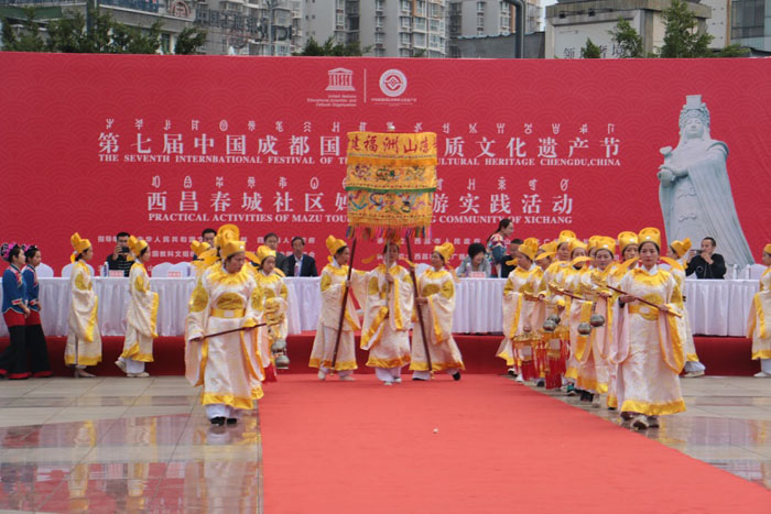 10月17日,第七屆中國成都國際非物質(zhì)文化遺產(chǎn)節(jié)——西昌春城社區(qū)媽祖巡游實踐活動在四川省涼山彝族自治州西昌市舉行。中國社會科學院世界宗教研究所研究員陳進國博士、西昌市政協(xié)副主席吳仿、四川省福建商會會長陳冬、福建湄洲媽祖祖廟董事會董事杜建賢、西昌市邛旅投公司總經(jīng)理黃海等出席活動。