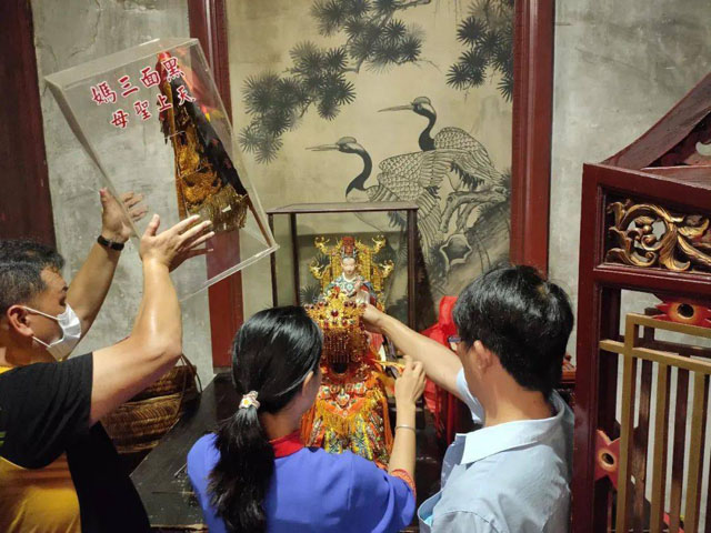 6月29日,臺(tái)灣臺(tái)南府城廣安堂堂主王鵬源恭抬分靈媽祖“黑面三媽”抵達(dá)廈門高崎機(jī)場(chǎng),并配合工作人員進(jìn)行隔離。為了讓“黑面三媽”盡早回娘家謁祖,王鵬源還在第一時(shí)間委托大陸友人將“黑面三媽”送抵湄洲媽祖祖廟。