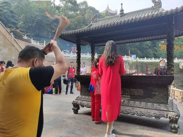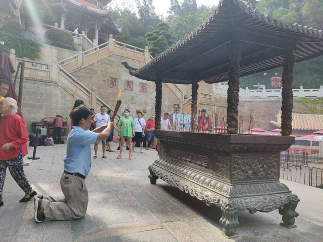 上午7時(shí)40分許,王鵬源二人來(lái)到湄洲媽祖祖廟,在工作人員的幫助下,兩人在天后殿完成莊嚴(yán)的朝拜儀式。
